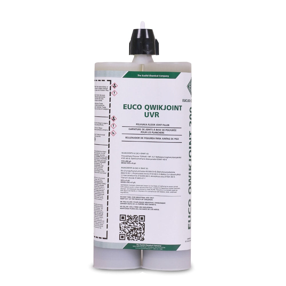 EUCO QWIKJOINT UVR is a two-component product packaged in 22 oz (600 mL) side-by-side cartridges (12/case) and 10 gal (37.9 L) kits for all 33 standard colors. The mix ratio for all packaging sizes is 1:1.
