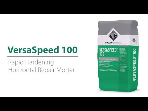 VersaSpeed 100 is a single-component (meaning you just add water), rapid hardening repair mortar. Designed for fast repairs, it uses micro-fiber reinforcement to reduce shrinkage and enhance strength. Once repaired and cured, surfaces can take regular traffic in a very short time. It’s formulated for horizontal repairs: floors, pavement, decks, loading dock surfaces, etc. It also works in vertical or overhead “form & pour” applications under certain circumstances.